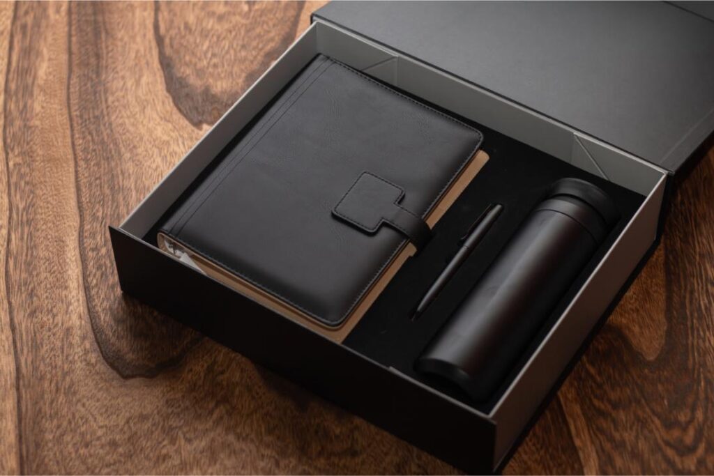 社名やロゴを箔押しできる、高品質なスケジュール手帳とボールペンのセットです。
